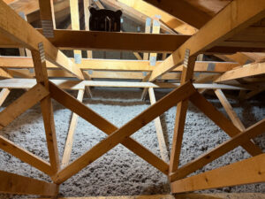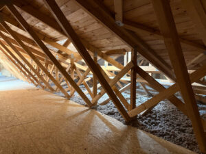 Tloušťka 40cm, část střechy se foukala do stropního meziprostoru, kde byl zbudován nový sádrokartonový strop a z prostoru půdy zaklopeno OSB deskami. Foukáno bylo na tl. 46 cm včetně zafoukání pozednic a příček .